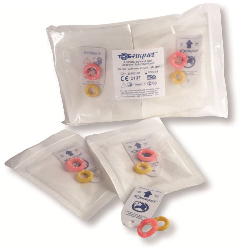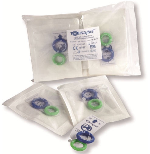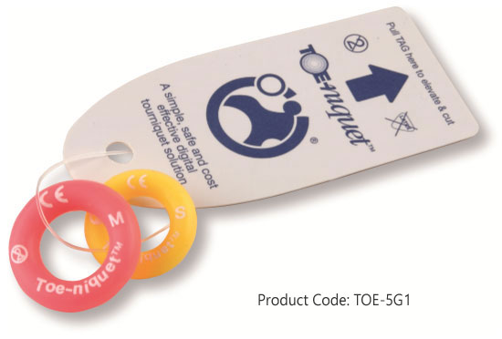 Toe-niquets™ are Single Use disposable 'elastic-ring' tourniquet devices designed to stop blood flow in digits of the hands and feet (fingers and toes) for use during surgery, trauma or first aid. Toe-niquets™ are easily applied by rolling over the tip of any digit.